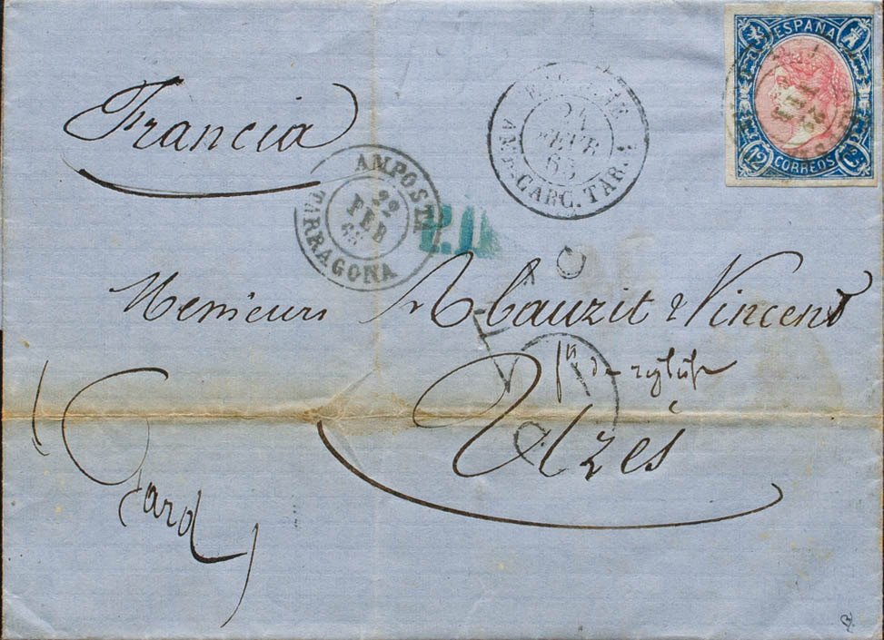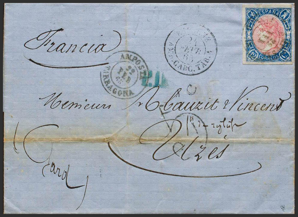 70. 1865. 12 cuartos azul y rosa. AMPOSTA a UZES (FRANCIA). Matasello AMPOSTA / TARRAGONA. MAGNIFICA Y MUY RARA. Ex-Tizón.