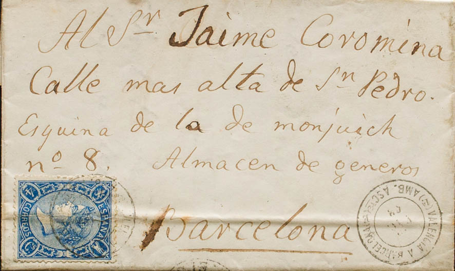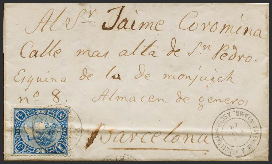 75. 1865. 4 cuartos azul. MOLINS DE REY a BARCELONA. Matasello ambulante VALENCIA A BARCELONA / AMB.ASCTE. MAGNIFICA Y RARA. Ex-Tizón.