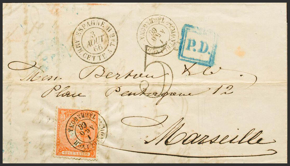 82. 1866. 12 cuartos naranja. MONTBLANCH a MARSELLA. Matasello MONTBLANCH / TARRAGONA. MAGNIFICA Y RARA. Ex-Tizón.