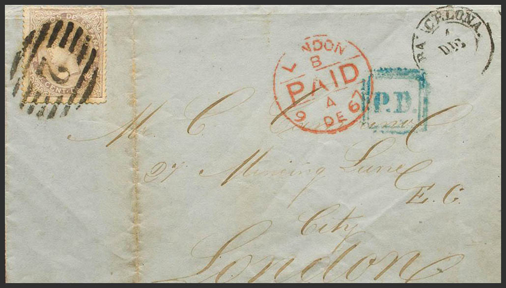92. 1867. 20 cts lila. BARCELONA a LONDRES (INGLATERRA). MAGNIFICA. Ex-Tizón.