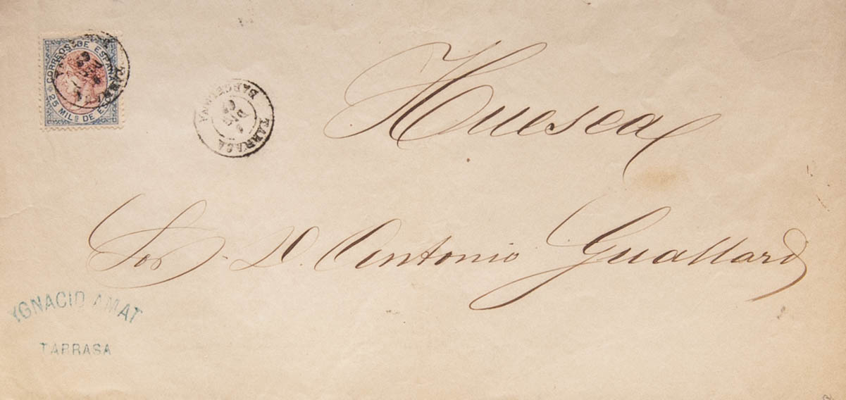 95. 1867. 25 cts azul y rosa. TARRASA a HUESCA. Matasello TARRASA / BARCELONA. MAGNIFICA Y MUY RARA TARIFA DE IMPRESOS. Ex-Tizón.