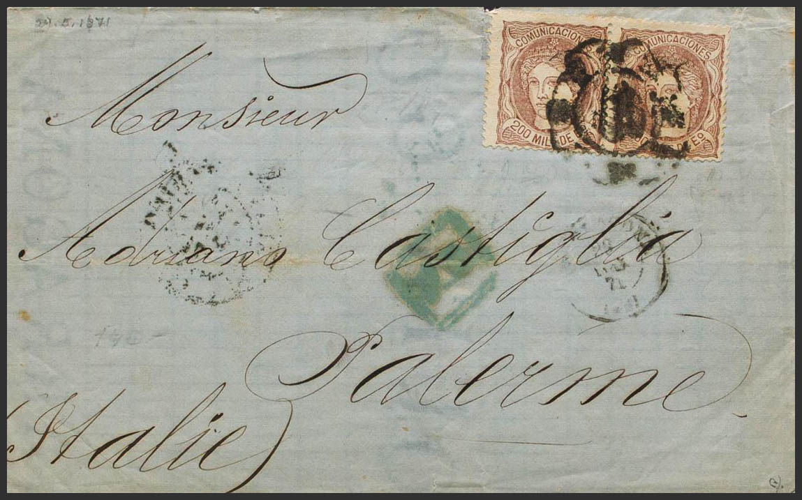 109(2). 1871. 200 mils castaño, pareja. TARRAGONA a PALERMO (ITALIA). MAGNIFICA Y MUY RARO FRANQUEO DE DOBLE PORTE A ITALIA. Ex-Tizón.