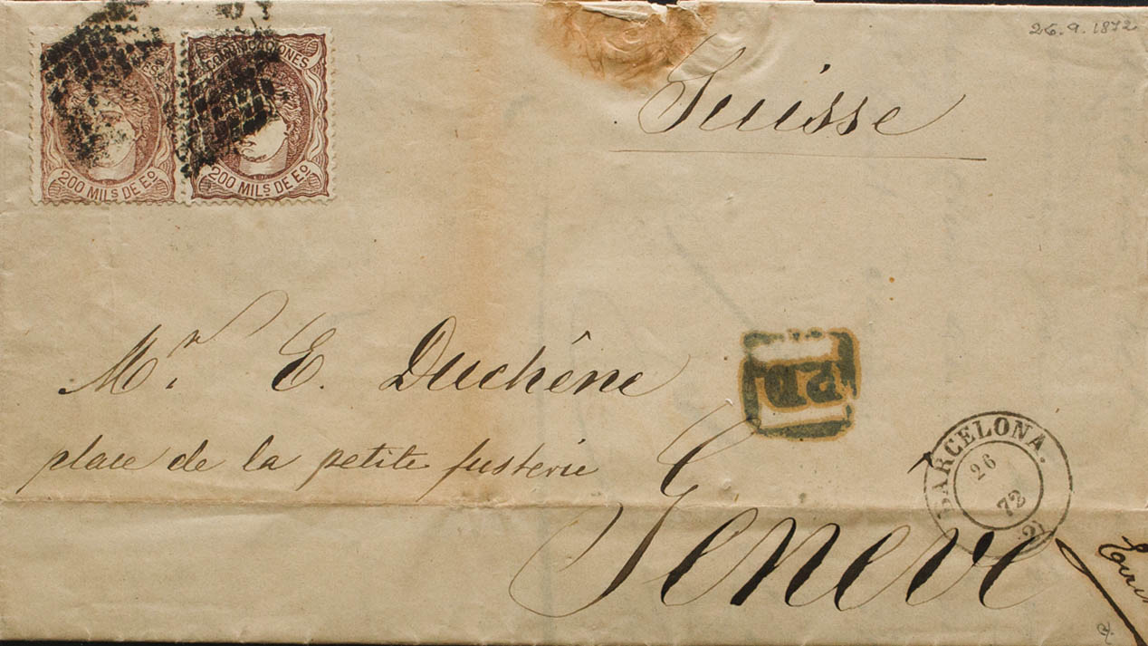 109(2). 1872. 200 mils castaño, dos sellos. BARCELONA a GINEBRA (SUIZA). MAGNIFICA Y MUY RARO FRANQUEO DE DOBLE PORTE A SUIZA SEGUN TARIFA DE ENERO DE 1867. Ex-Tizón.