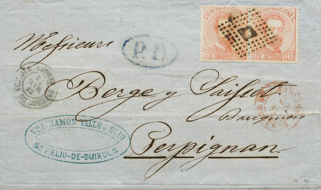 125(2). 1873. 40 cts castaño claro, pareja. SAN FELIU DE GUIXOLS a PERPIÑAN (FRANCIA). MAGNIFICA E INUSUAL FRANQUEO DE DOBLE PORTE A FRANCIA. Ex-Tizón.