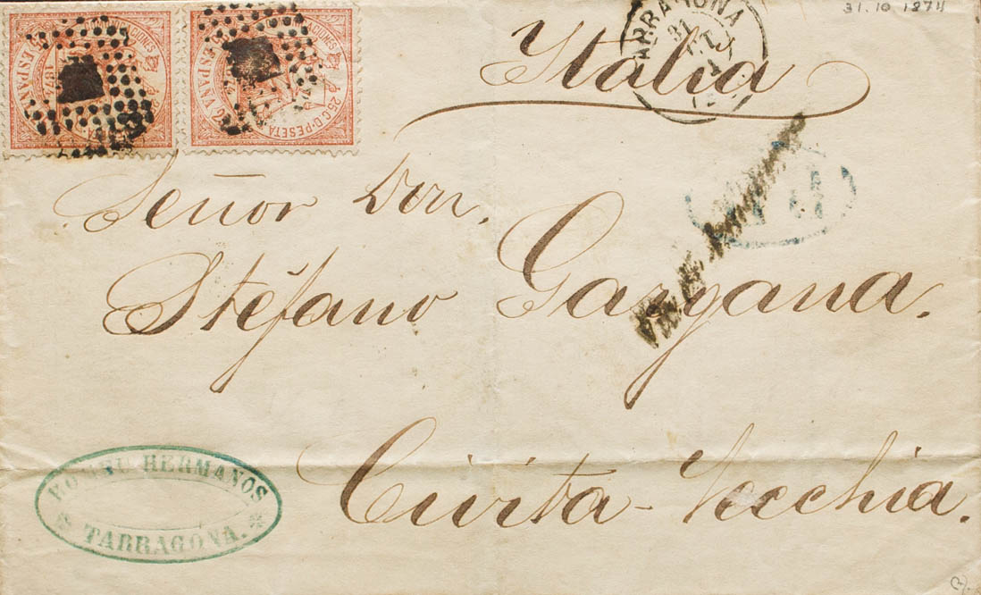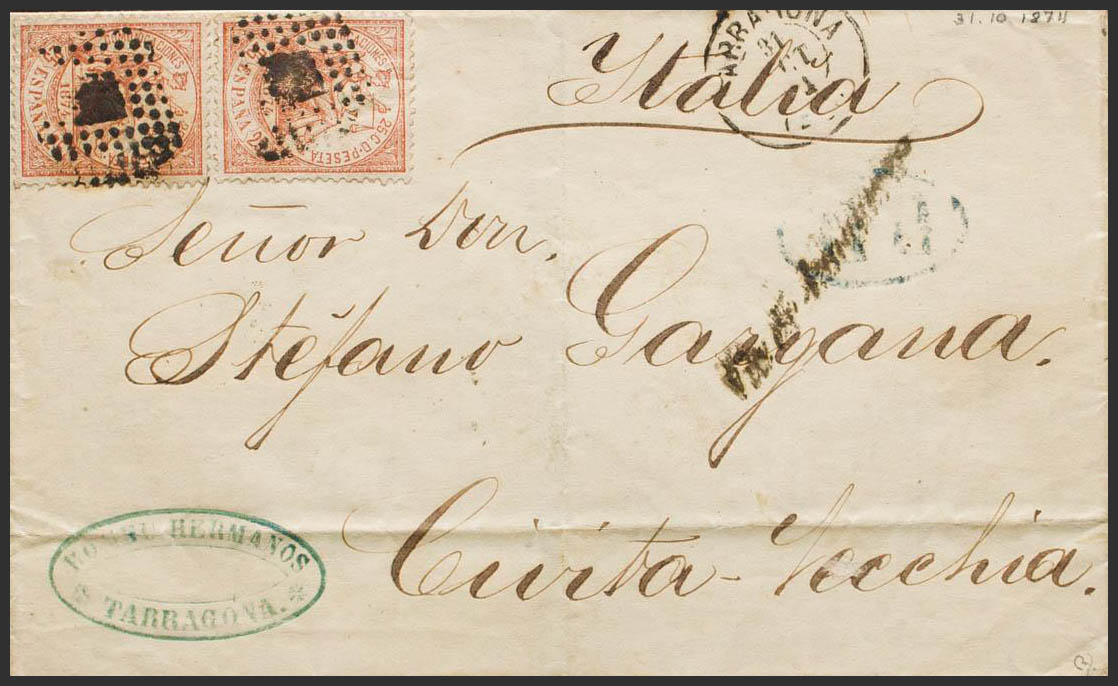 147(2). 1874. 25 cts castaño, dos sellos. TARRAGONA a CIVITA VECCHIA (ITALIA). En el frente marca VIA DI JUNQUERA. MAGNIFICA E INUSUAL DESTINO. Ex-Tizón.