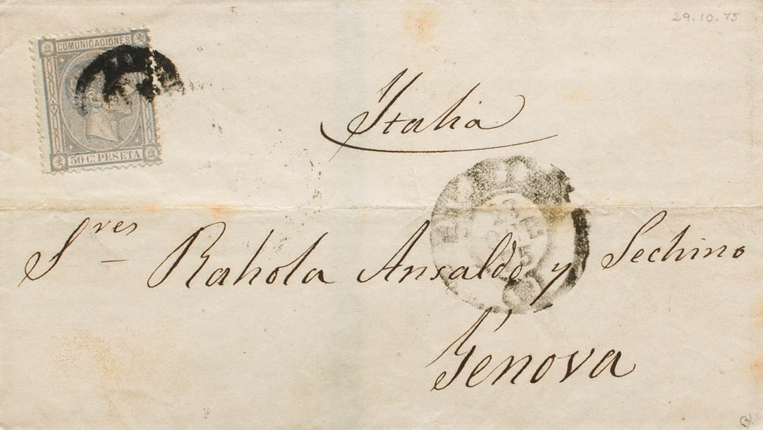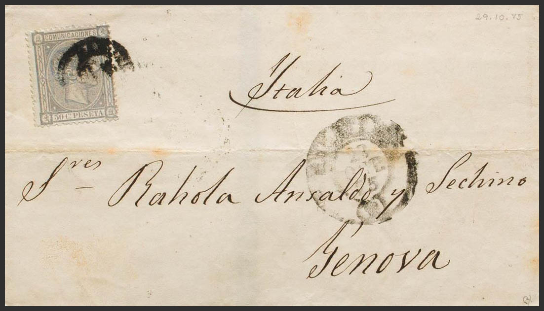 168. 1875. 50 cts lila. BARCELONA a GENOVA (ITALIA). BONITA E INUSUAL DOBLE PORTE A ITALIA. Ex-Tizón.