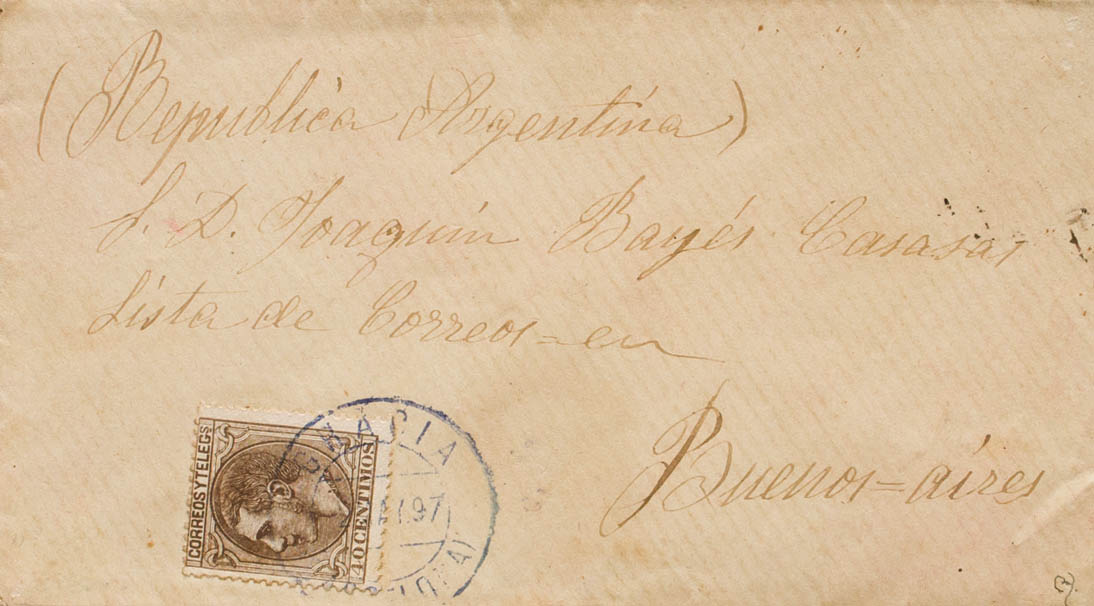 205. 1887. 40 cts castaño. BARCELONA a BUENOS AIRES (ARGENTINA). Matasello GRACIA / (BARCELONA), en azul-violeta. MAGNIFICA Y RARA. Ex-Tizón.