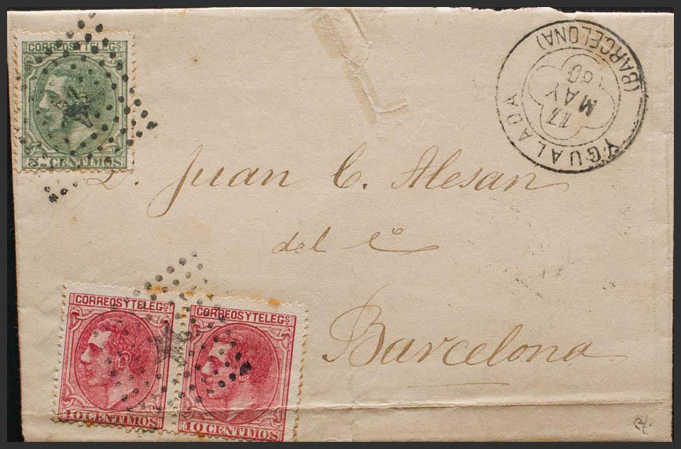 201, 202(2). 1880. 5 cts verde y 10 cts rosa, dos sellos. IGUALADA a BARCELONA. MAGNIFICA E INUSUAL COMBINACION DE FRANQUEO PARA COMPLETAR LA TARIFA DE 25 CTS. Ex-Tizón.
