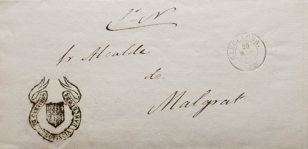 1869. BARCELONA a MALGRAT. Marca de franquicia GOBIERNO DE PROVINCIA BARCELONA, en negro. MAGNIFICA.