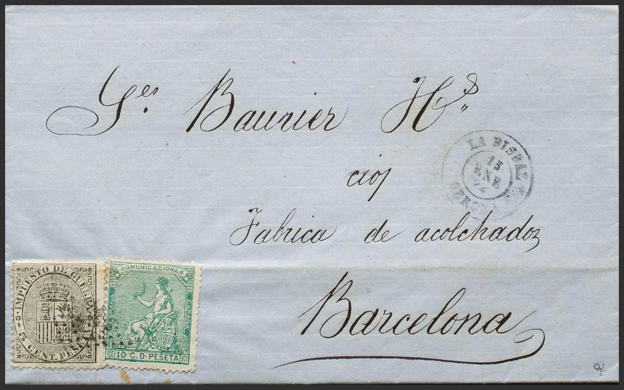 133, 141. 1874. 10 cts verde y 5 cts negro. LA BISBAL a BARCELONA. En el frente fechador LA BISBAL / BARCELONA. MAGNIFICA. Ex-Tizón.