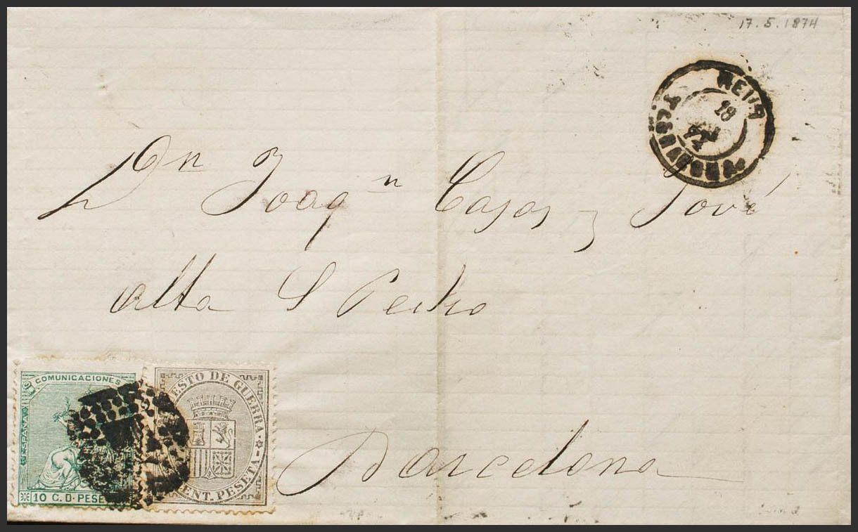 133, 141. 1873. 10 cts verde y 5 cts negro. REUS a BARCELONA. En el frente fechador REUS / TARRAGONA. MAGNIFICA. Ex-Tizón.