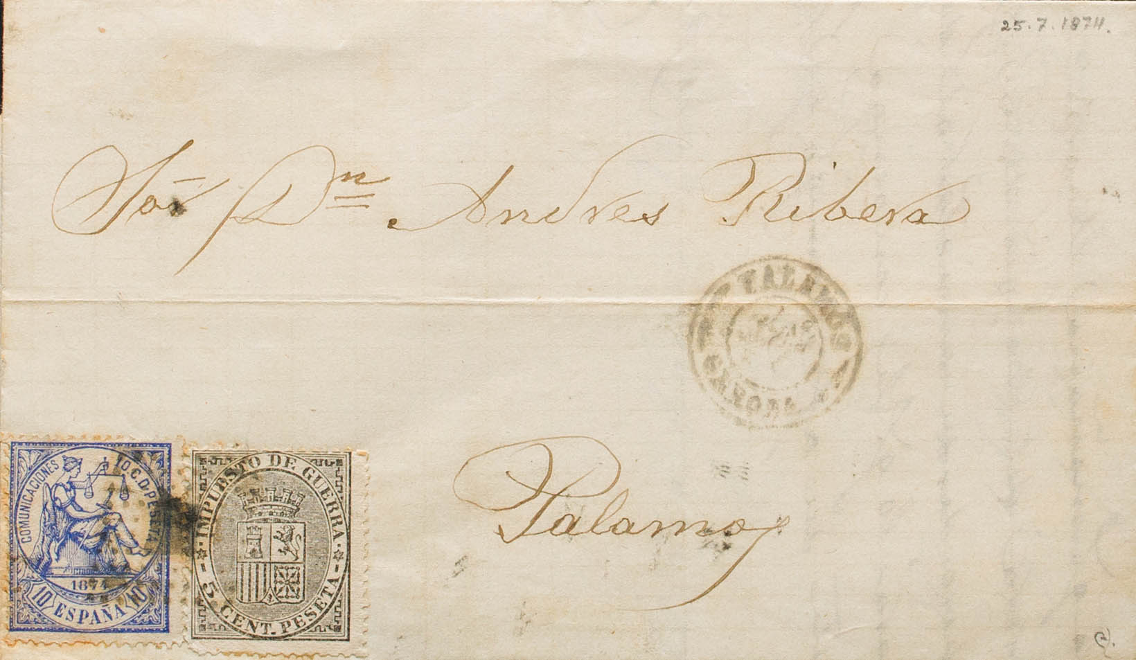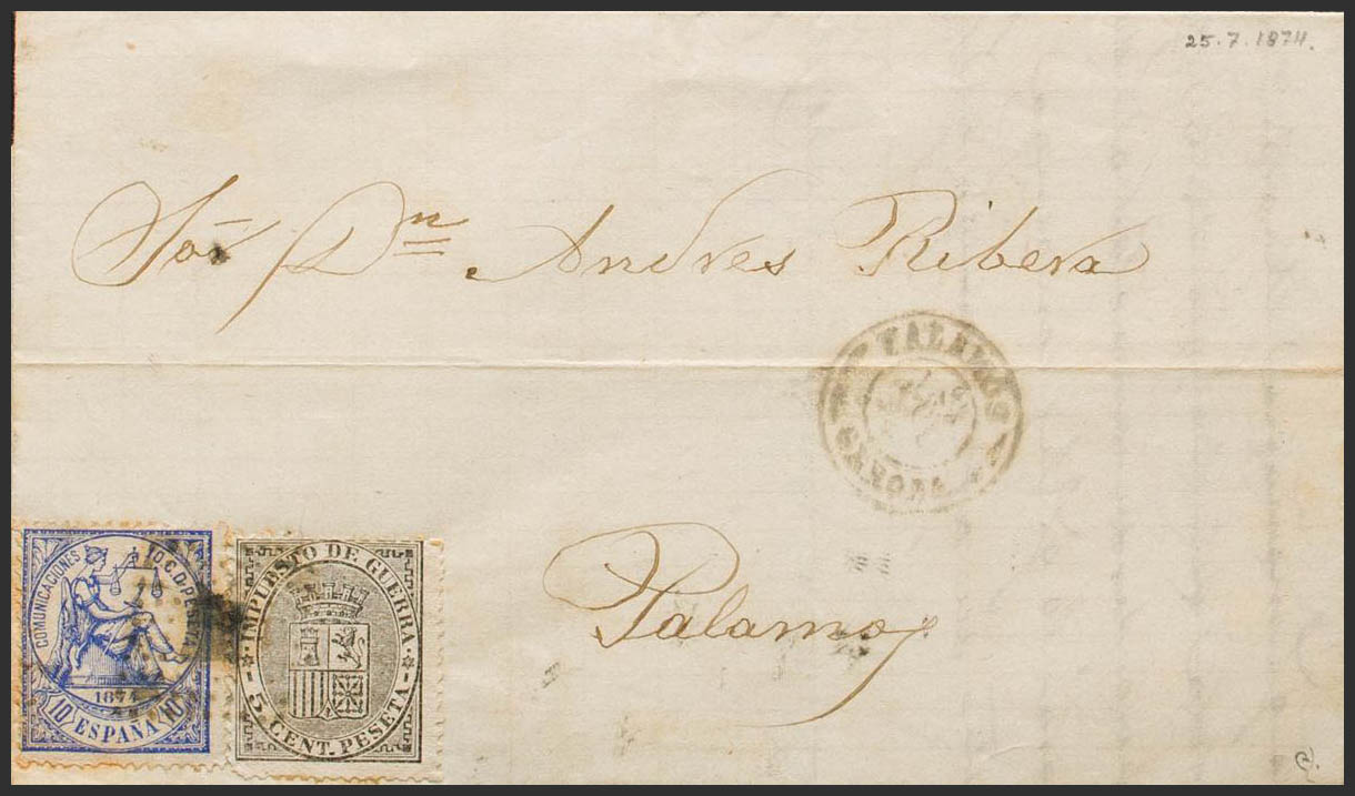 145, 141. 1874. 10 cts ultramar y 5 cts negro. BAGUR a PALAMOS. En el frente fechador PALAMOS / GERONA. MAGNIFICA. Ex-Tizón.