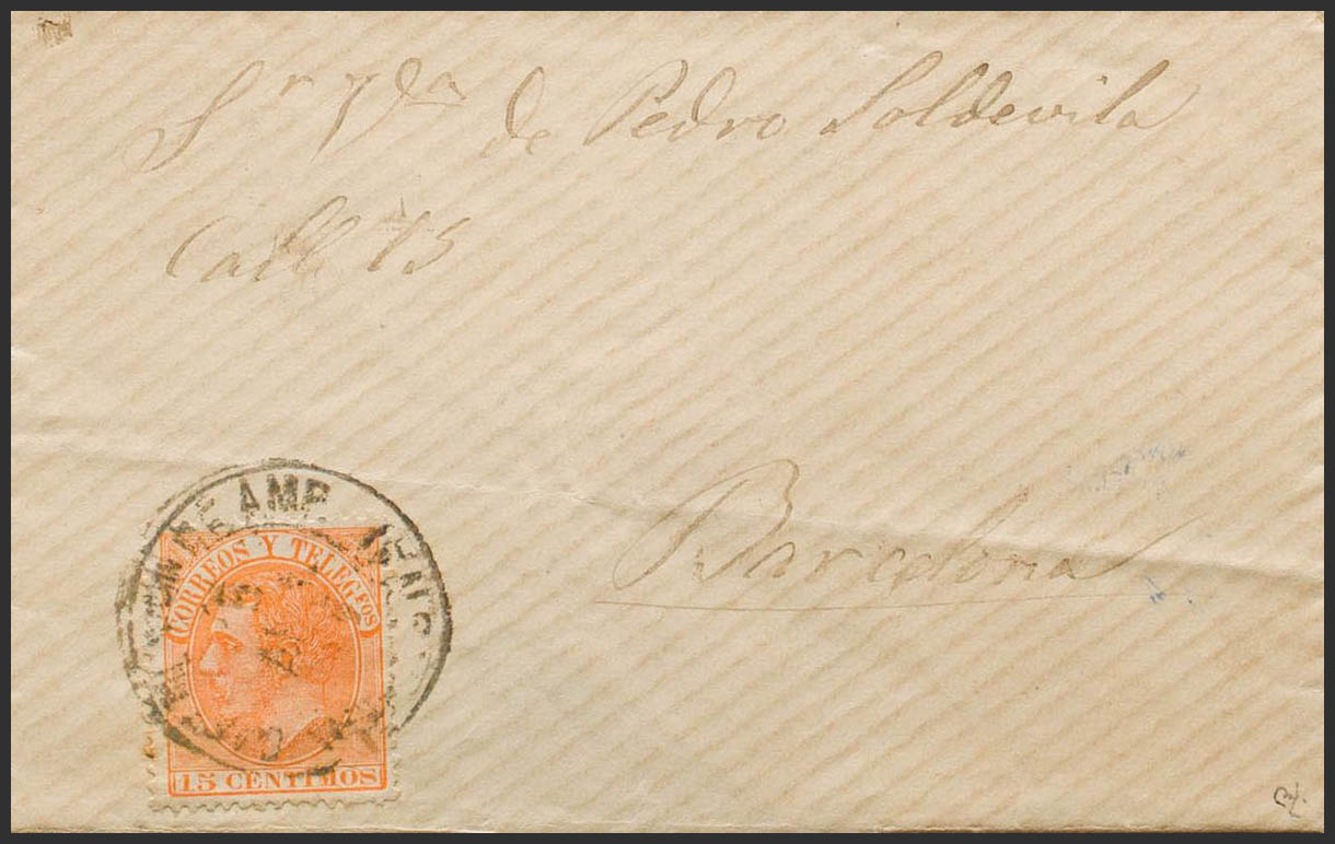 210. 1887. 15 cts naranja. CASTELLON DE AMPURIAS a BARCELONA. Matasello trébol CASTELLON DE AMP. / (GERONA). MAGNIFICA. Ex-Tizón.