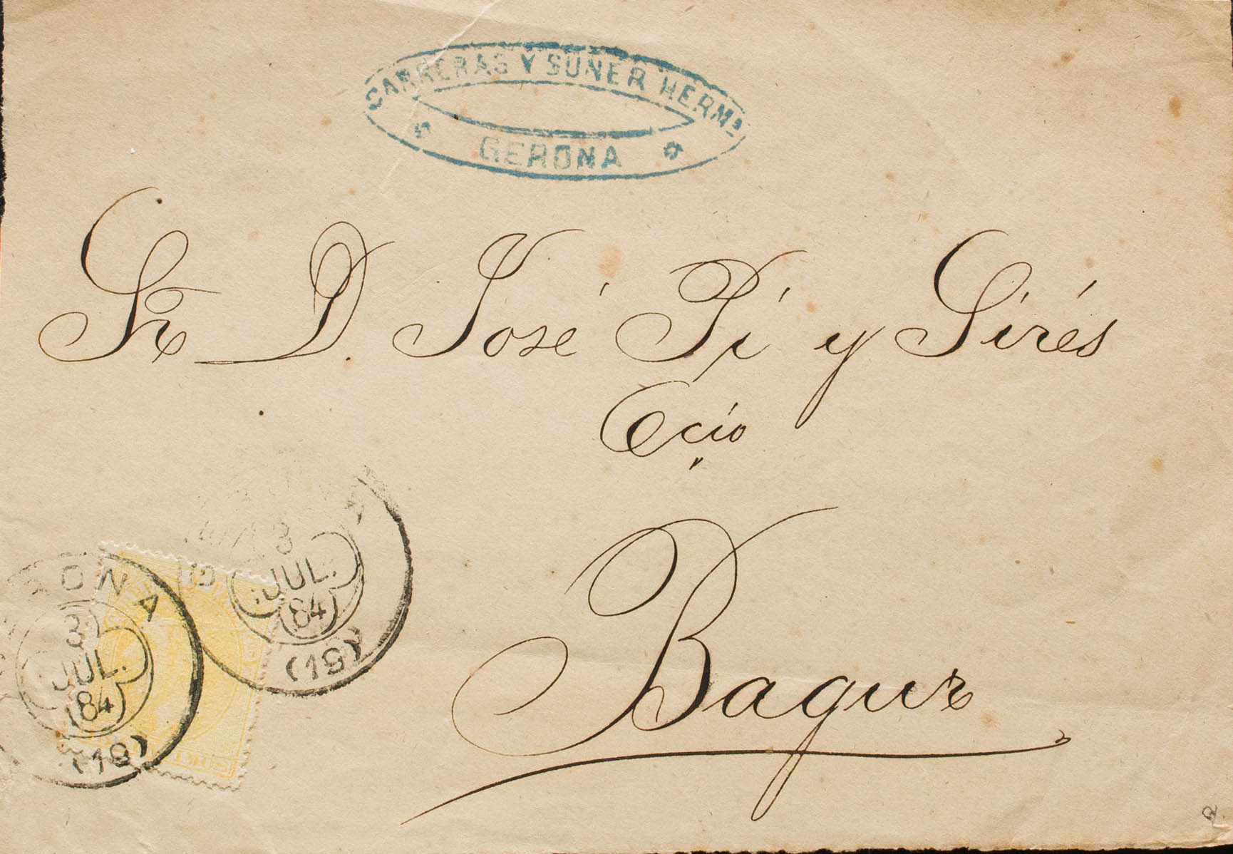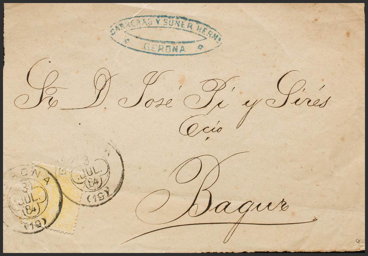 210. 1884. 15 cts amarillo. Frontal de GERONA a BAGUR. Matasello trébol GERONA / (19). MAGNIFICA Y RARA ESTA TONALIDAD EN CARTA. Ex-Tizón.