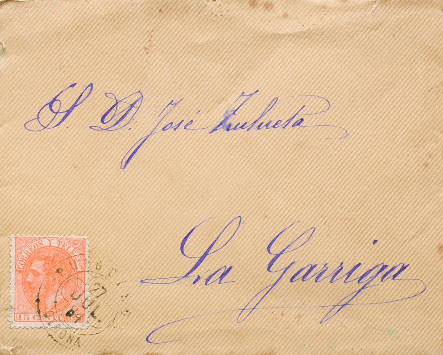 210. 1884. 15 cts naranja. PUIGCERDA a LA GARRIGA. Matasello trébol PUIGCERDA / GERONA, en azul. MAGNIFICA Y RARA. Ex-Tizón.