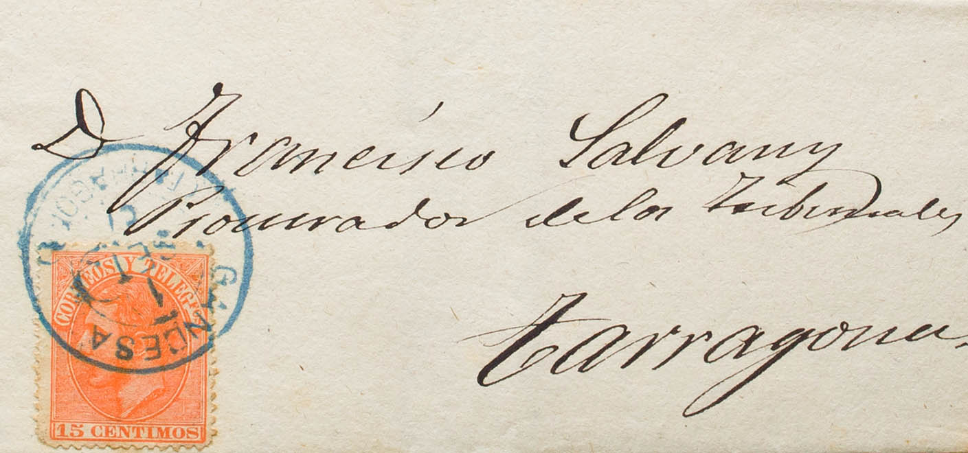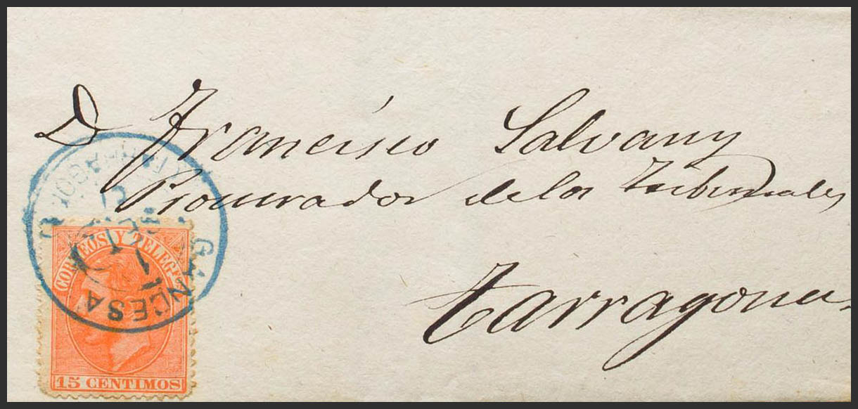 210. 1887. 15 cts naranja. GANDESA a TARRAGONA. Matasello trébol GANDESA / (TARRAGONA), en azul. MAGNIFICA Y RARISIMA. Ex-Tizón.