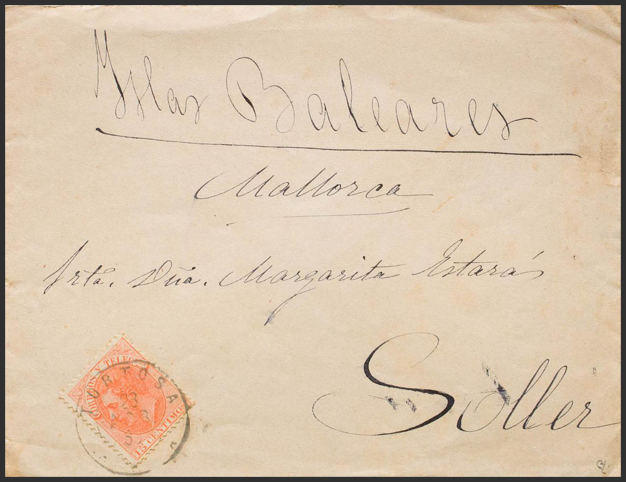 210. 1885. 15 cts naranja. TORTOSA a SOLLER. Matasello trébol TORTOSA / (TARRAGONA). MAGNIFICA. Ex-Tizón.