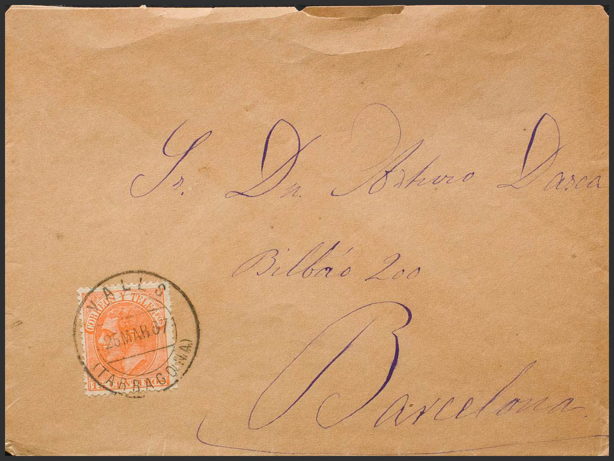 210. 1887. 15 cts naranja. VALLS a BARCELONA. Matasello VALLS / (TARRAGONA). MAGNIFICA. Ex-Tizón.
