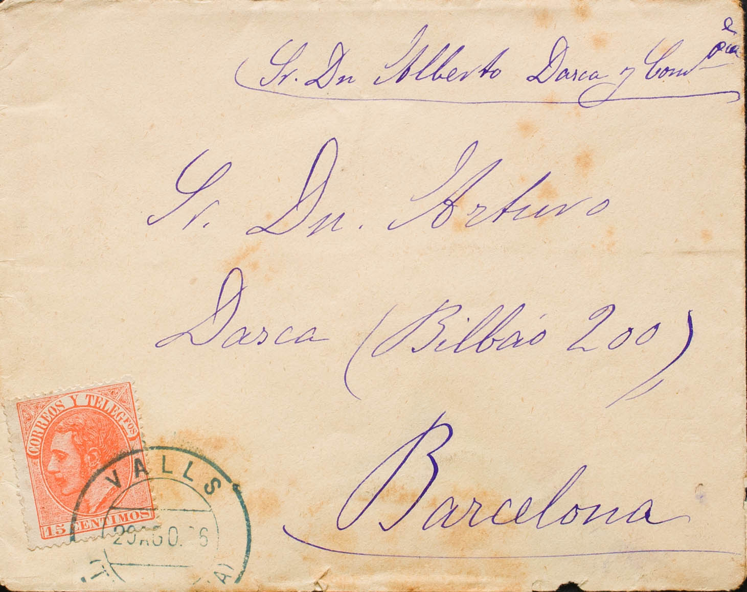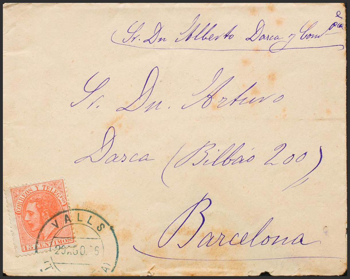 210. 1886. 15 cts bermellón. VALLS a BARCELONA. Matasello VALLS / (TARRAGONA), en azul. MAGNIFICA Y RARA. Ex-Tizón.