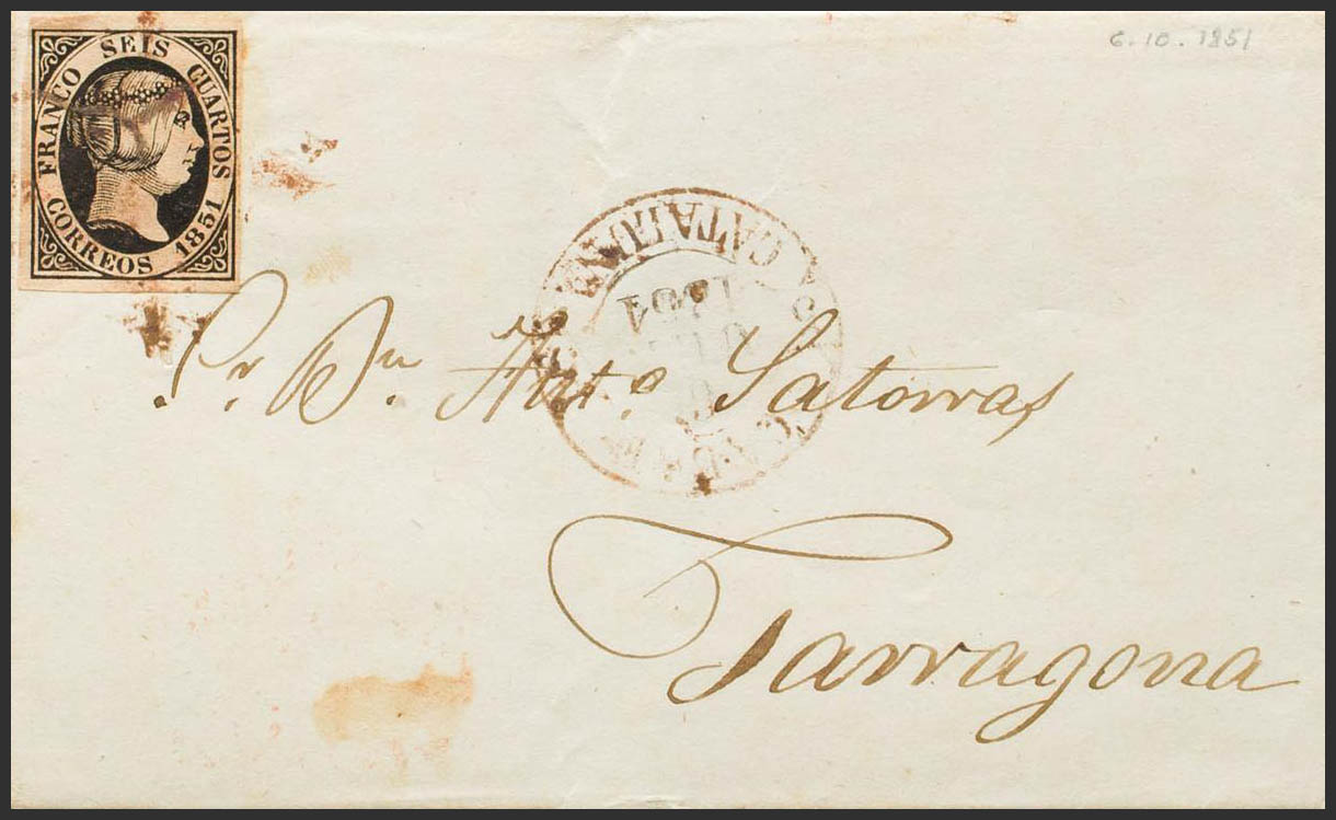 6. 1851. 6 cuartos negro. CALAF a TARRAGONA. Matasello ARAÑA, en rojo y en el frente baeza CALAF / CATALUÑA. MAGNIFICA Y RARA. Ex-Tizón.