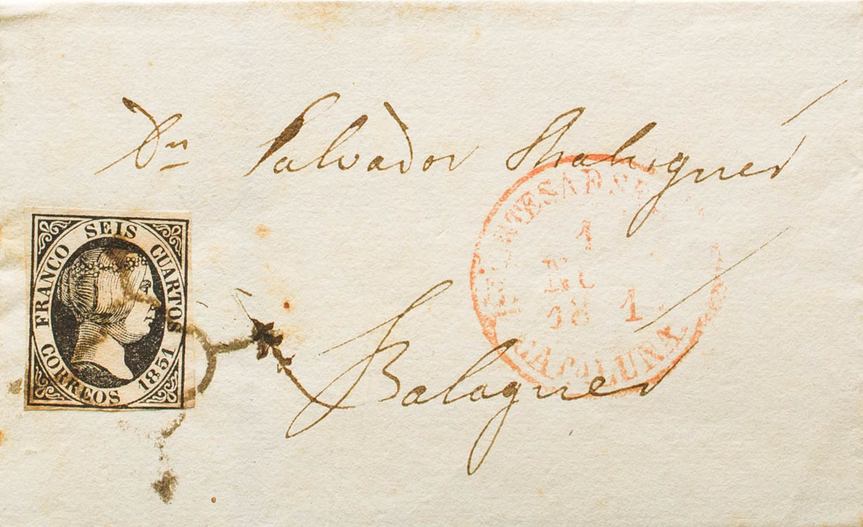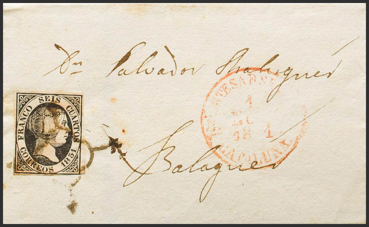 6. 1851. 6 cuartos negro. ARTESA DE SEGRE a BALAGUER. En el frente baeza ARTESA D SEGRE / CATALUÑA. MAGNIFICA Y RARA. Ex-Tizón.
