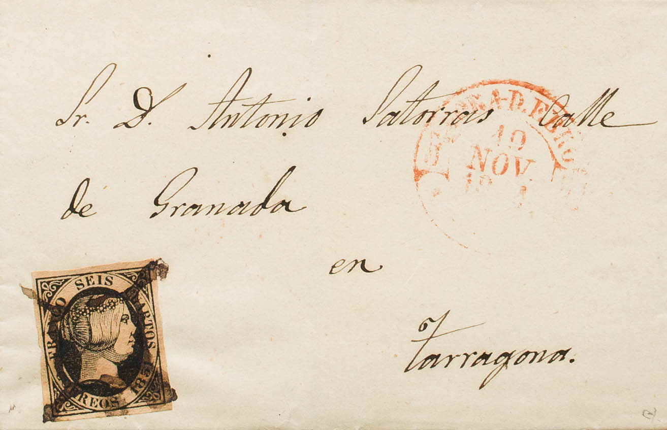 6. 1851. 6 cuartos negro. MORA DE EBRO a TARRAGONA. En el frente baeza MORA D. EBRO / CATALUÑA. MAGNIFICA. Ex-Tizón.
