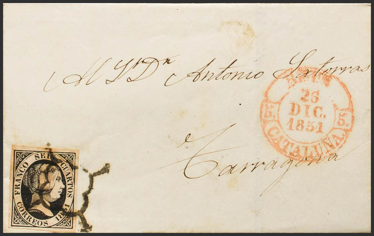 6. 1851. 6 cuartos negro. REUS a TARRAGONA. En el frente baeza REUS / CATALUÑA. MAGNIFICA. Ex-Tizón.