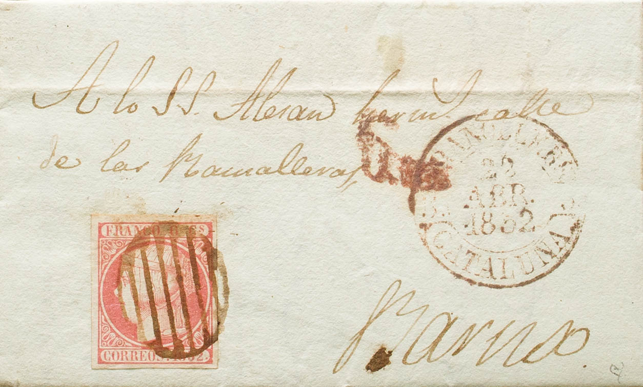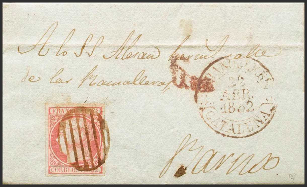 12. 1852. 6 cuartos rosa. GRANOLLERS a BARCELONA. Matasello PARRILLA, en tinta de escribir y en el frente baeza GRANOLLERS / CATALUÑA. MAGNIFICA. Ex-Tizón.