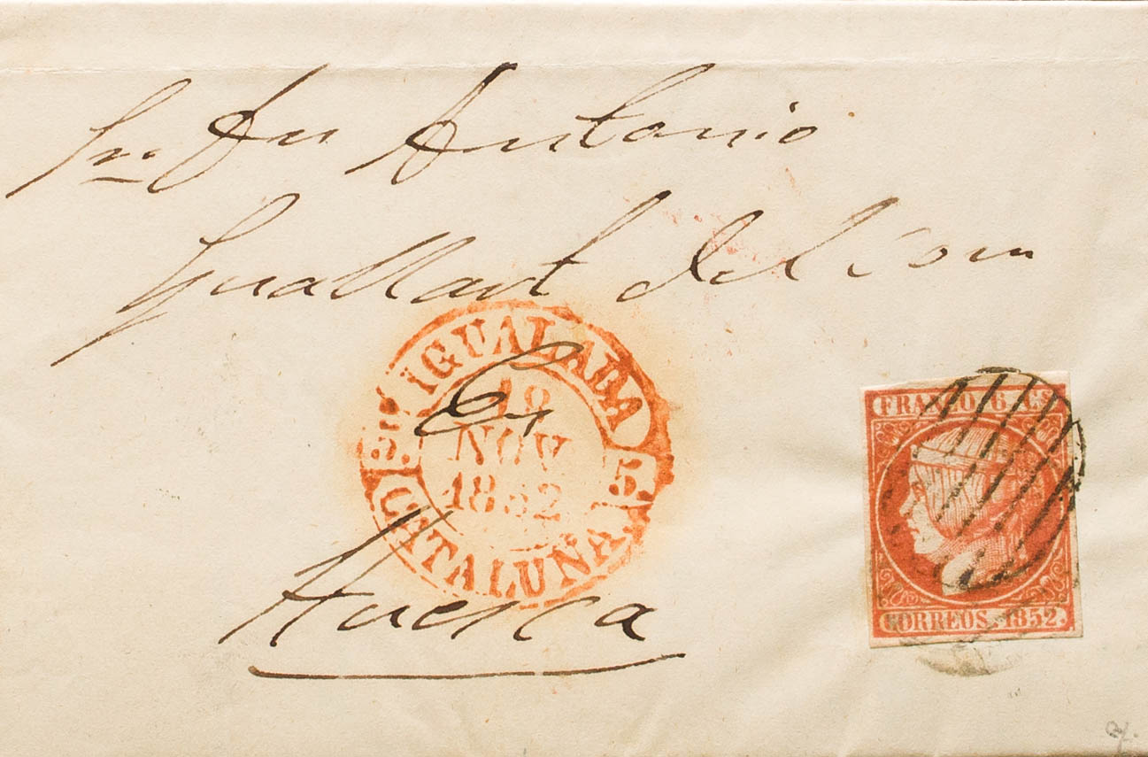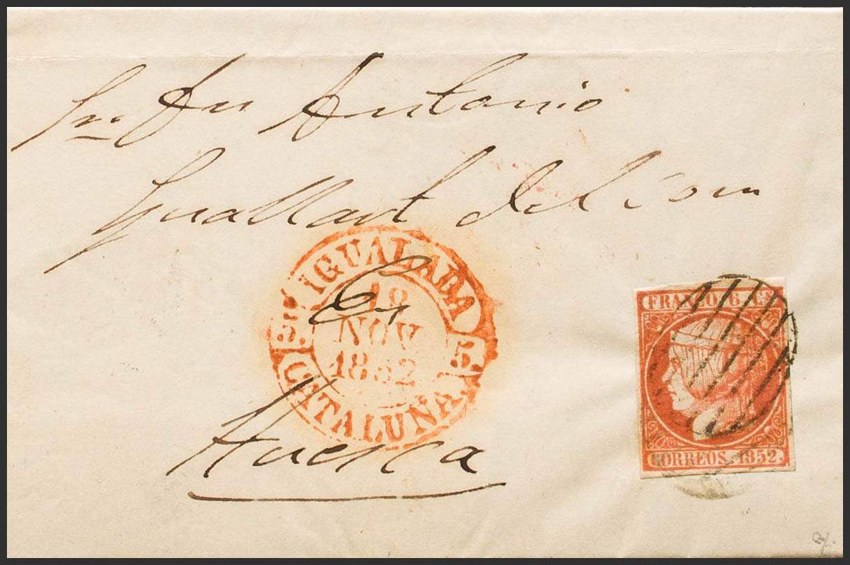 12. 1852. 6 cuartos rosa. IGUALADA a HUESCA. En el frente baeza IGUALADA / CATALUÑA. MAGNIFICA. Ex-Tizón.