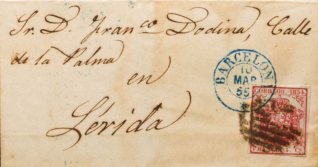 33. 1855. 4 cuartos carmÃn. BARCELONA a LERIDA. Matasello PARRILLA y fechador BARCELONA / * (Tipo I), en azul. MAGNIFICA. Ex-Tizón.