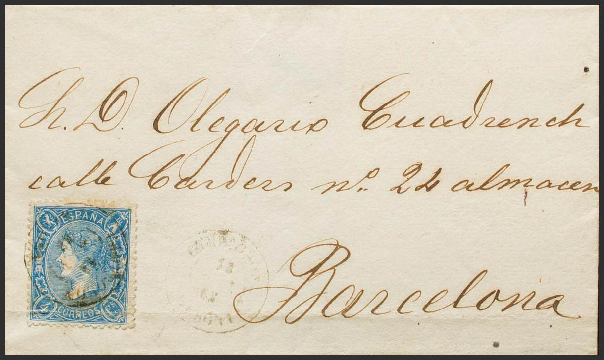 75. 1865. 4 cuartos azul (doblez de archivo). CAMPRODON a BARCELONA. Matasello CAMPRODON / GERONA (estampación débil). MAGNIFICA. Ex-Tizón.