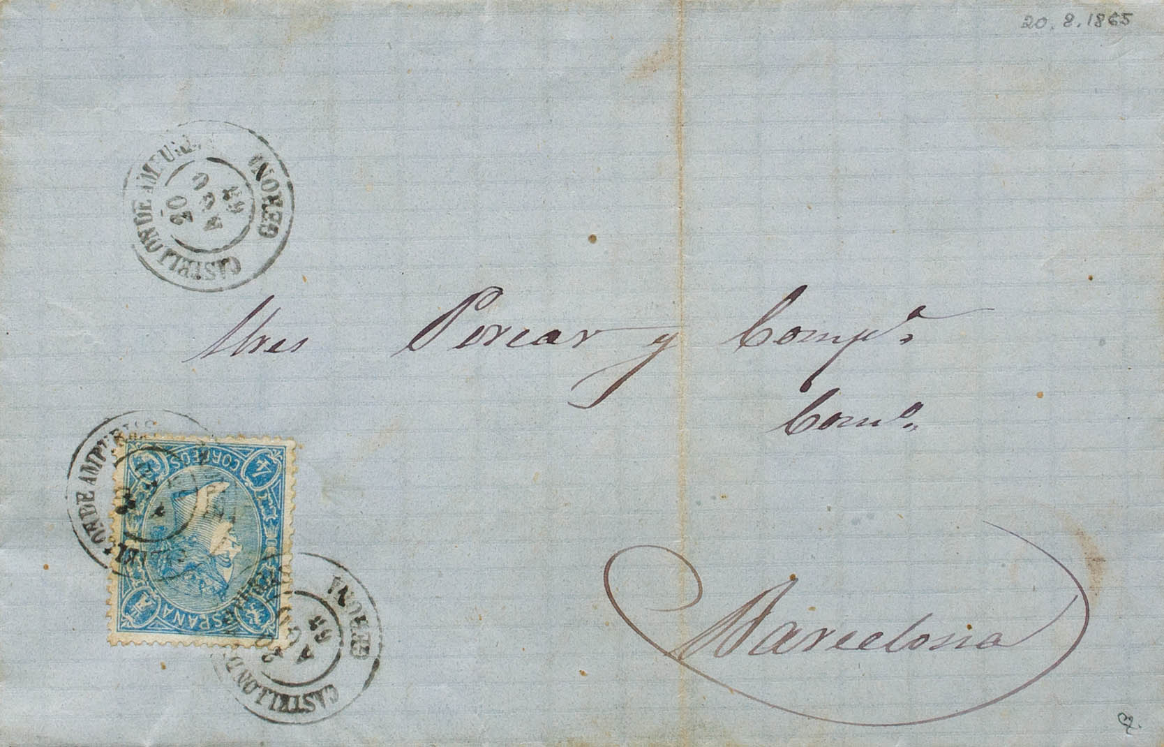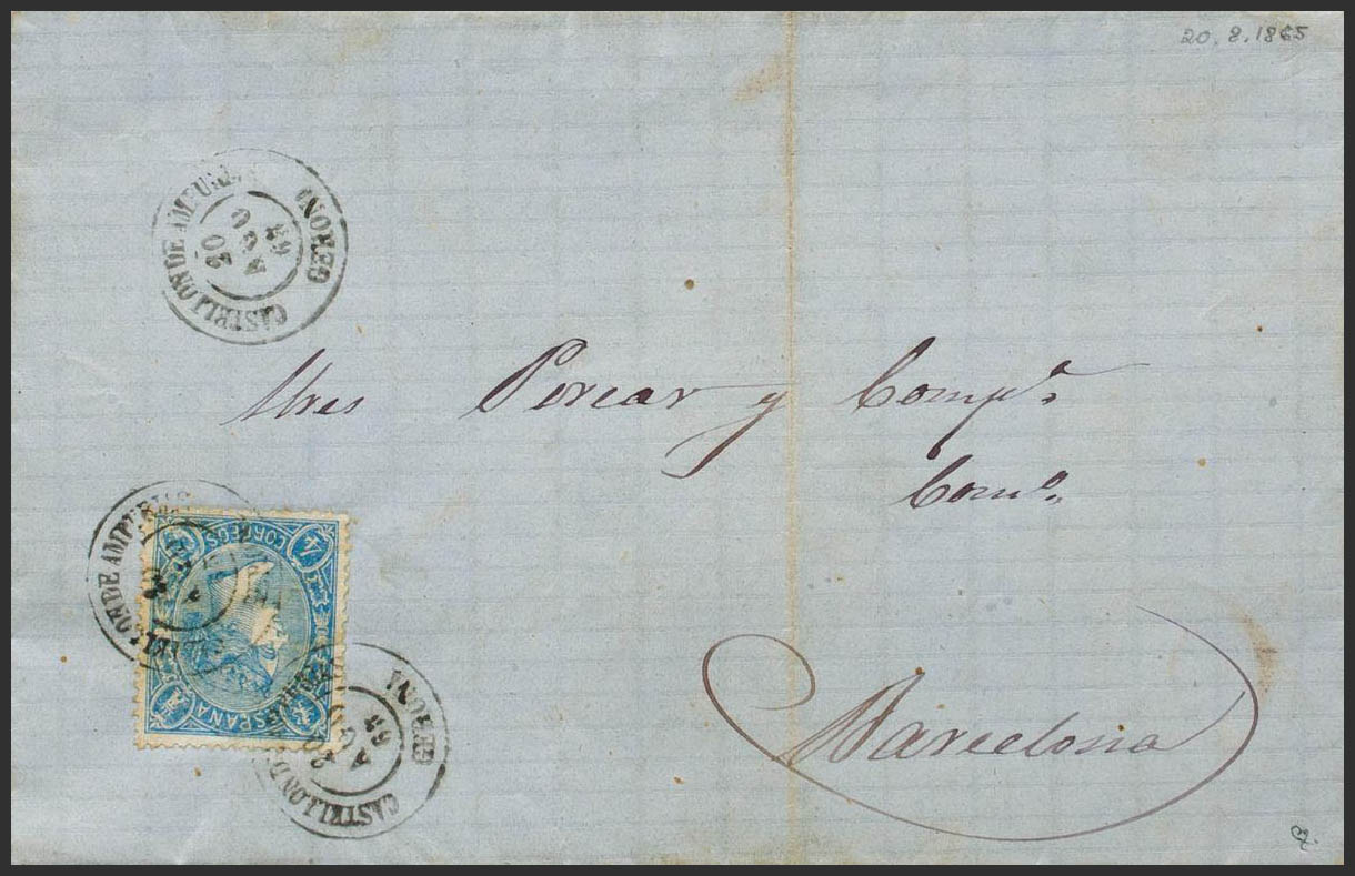 75. 1865. 4 cuartos azul. ROSAS a BARCELONA. Matasello CASTELLON DE AMPURIAS / GERONA. MAGNIFICA Y RARA. Ex-Tizón.