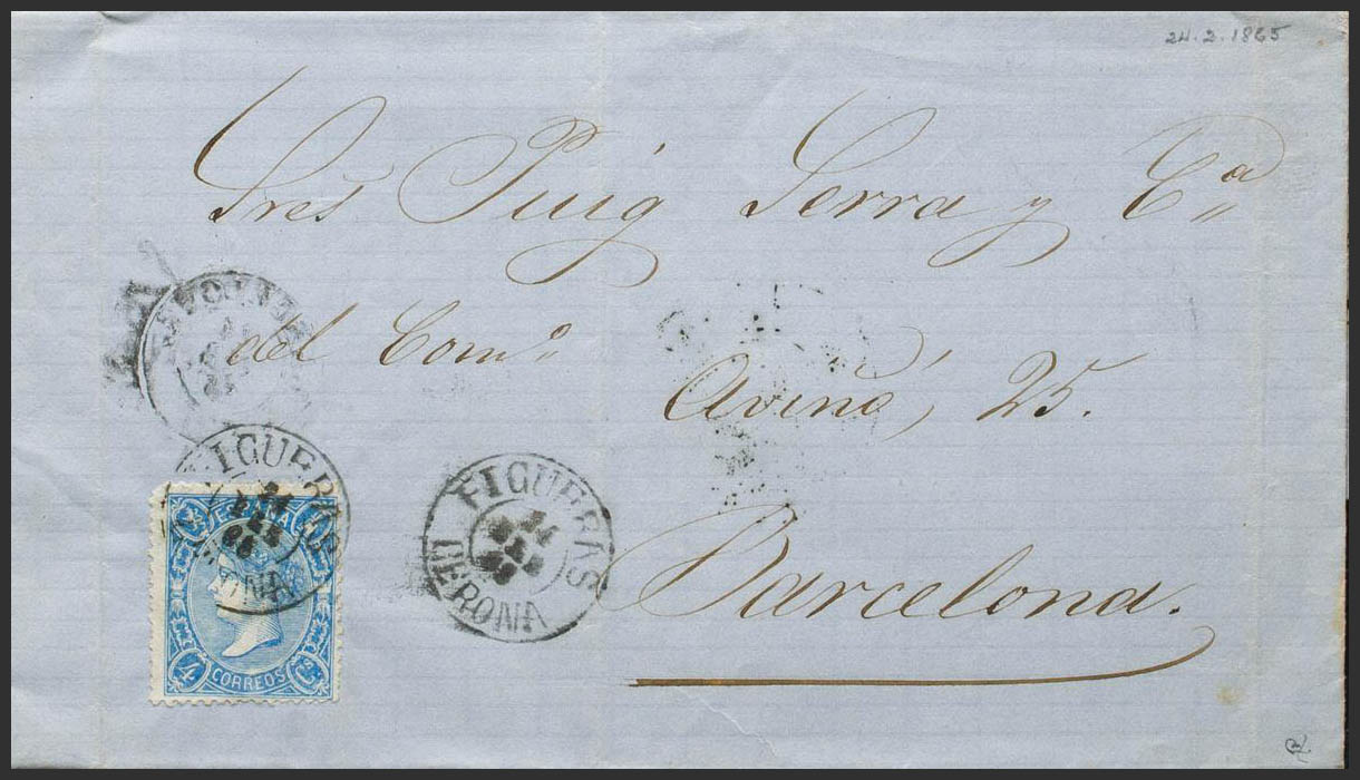75. 1865. 4 cuartos azul. FIGUERAS a BARCELONA. Matasello FIGUERAS / GERONA (tipo modificado). MAGNIFICA Y RARA. Ex-Tizón.