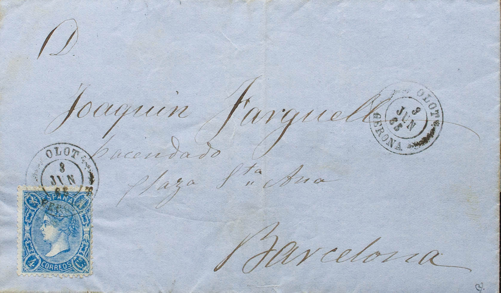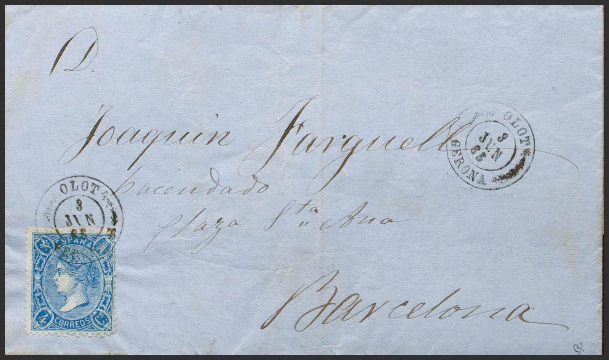 75. 1865. 4 cuartos azul. OLOT a BARCELONA. Matasello OLOT / GERONA. MAGNIFICA Y RARA. Ex-Tizón.