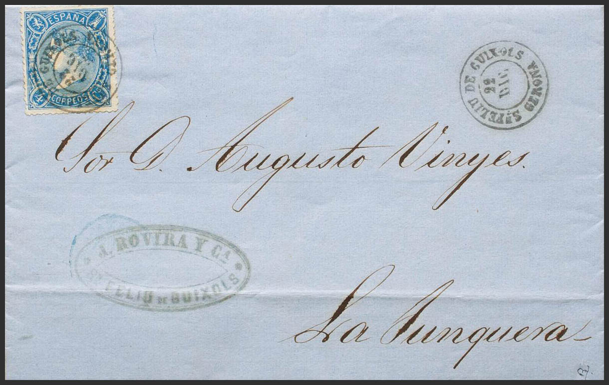 75. 1865. 4 cuartos azul. SAN FELIU DE GUIXOLS a LA JUNQUERA. Matasello SN. FELIU DE GUIXOLS / GERONA. MAGNIFICA. Ex-Tizón.