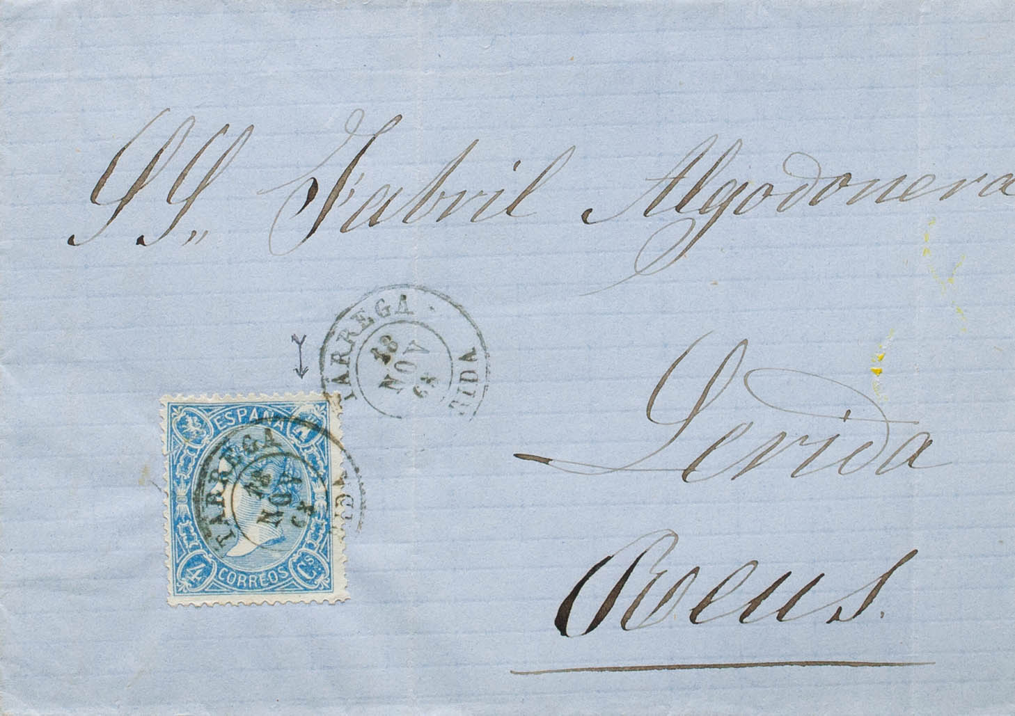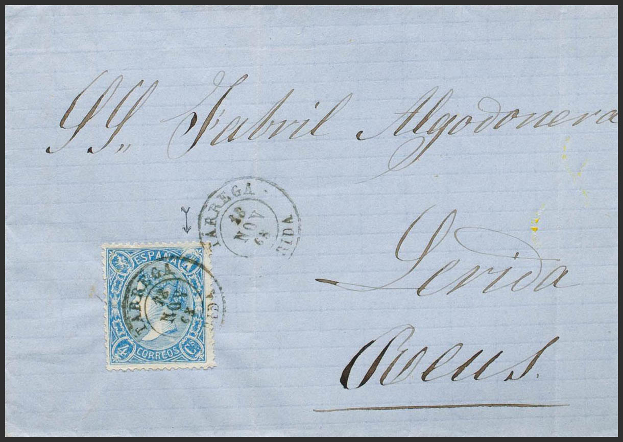 75. 1865. 4 cuartos azul. TARREGA a REUS. Matasello TARREGA / LERIDA. MAGNIFICA. Ex-Tizón.