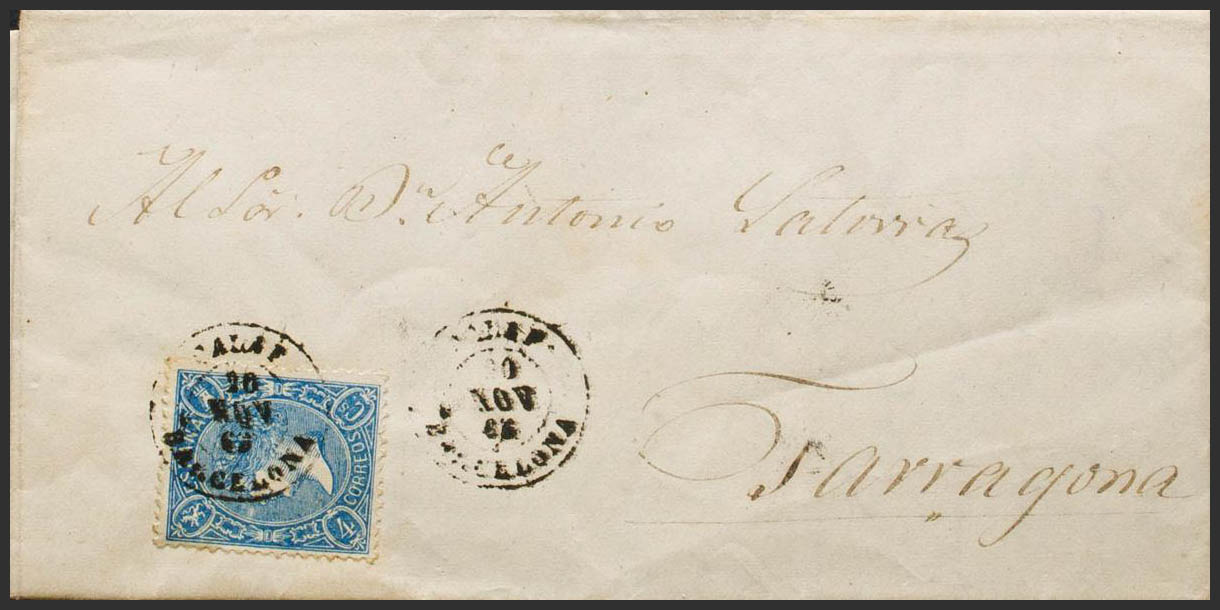 75. 1865. 4 cuartos azul. CALAF a TARRAGONA. Matasello CALAF / BARCELONA. MAGNIFICA. Ex-Tizón.