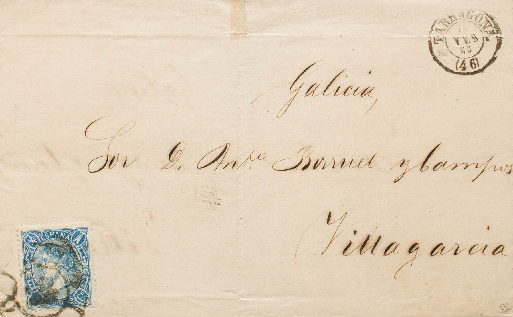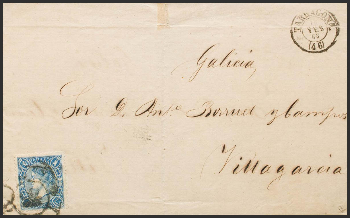 75. 1865. 4 cuartos azul. TARRAGONA a VILLAGARCIA. Matasello R.CARRETA Nº46. MAGNIFICA. Ex-Tizón.