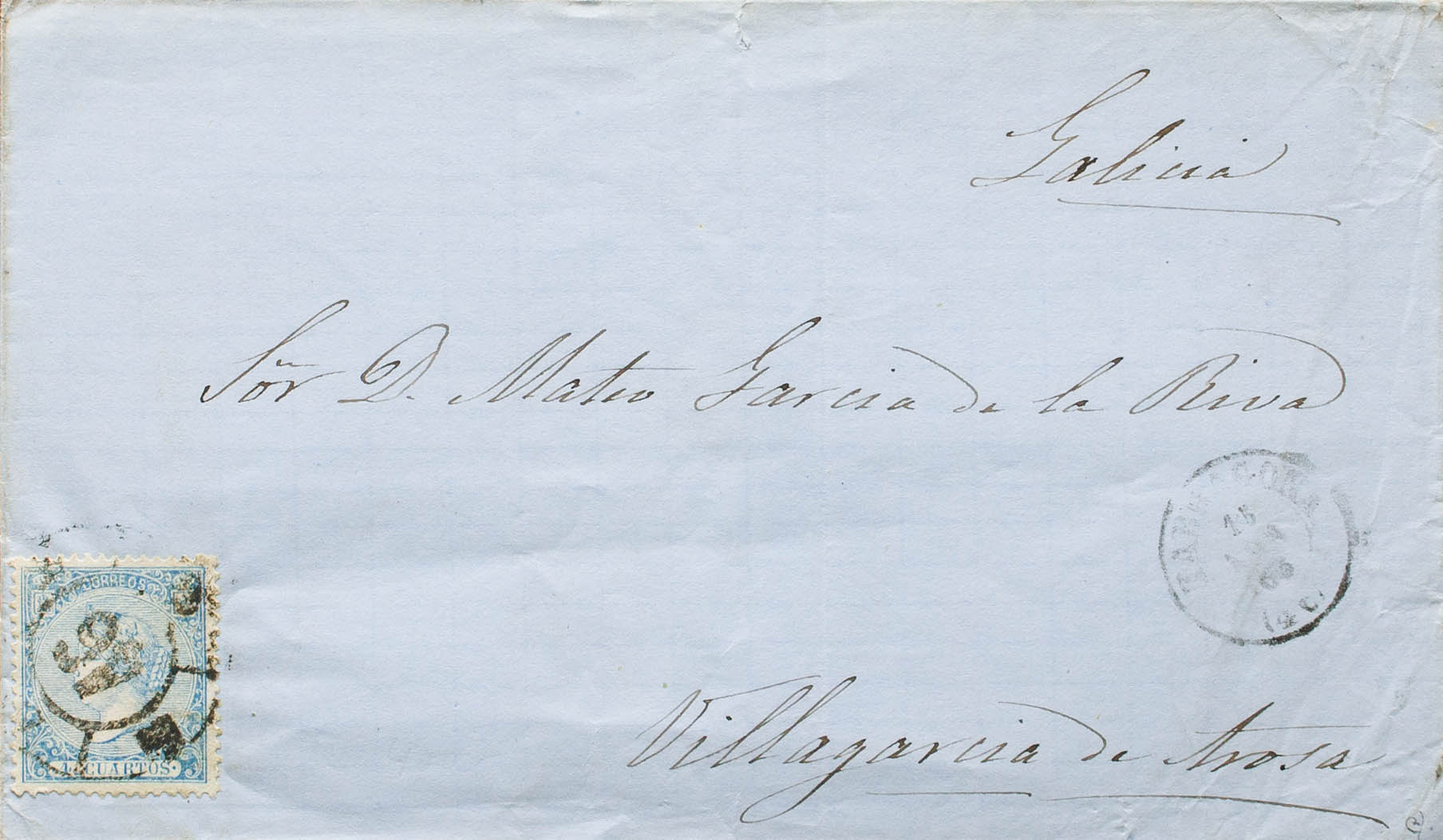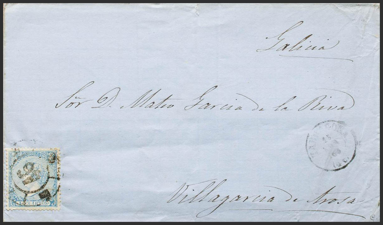 81. 1866. 4 cuartos azul. TARRAGONA a VILLAGARCIA DE AROSA. Matasello R.CARRETA Nº46. MAGNIFICA. Ex-Tizón.