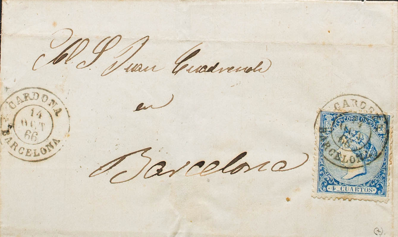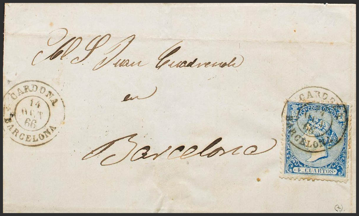81. 1865. 4 cuartos azul. CARDONA a BARCELONA. Matasello CARDONA / BARCELONA. MAGNIFICA Y RARA. Ex-Tizón.