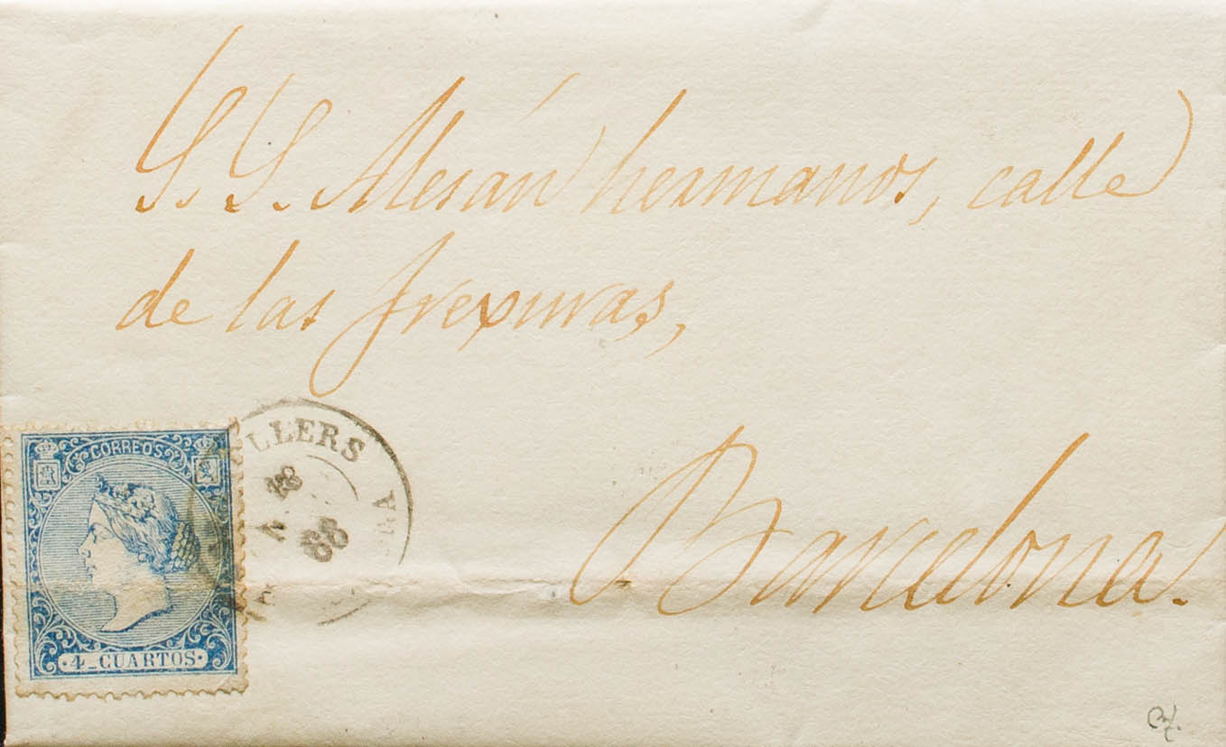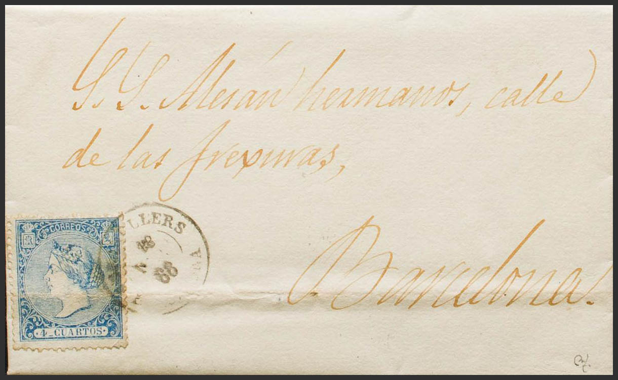 81. 1866. 4 cuartos azul (doblez de archivo). GRANOLLERS a BARCELONA. Matasello GRANOLLERS / BARCELONA. BONITA. Ex-Tizón.