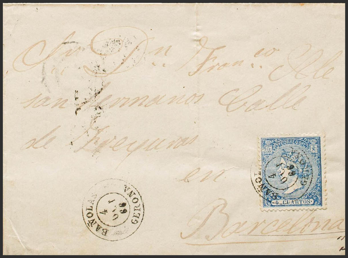 81. 1866. 4 cuartos azul. BAÑOLAS a BARCELONA. Matasello BAÑOLAS / GERONA. MAGNIFICA Y RARA. Ex-Tizón.