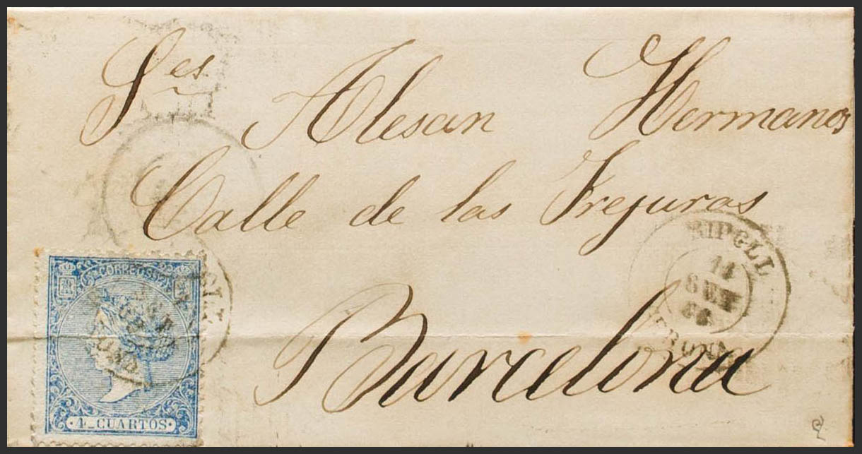 81. 1866. 4 cuartos azul (doblez de archivo). RIPOLL a BARCELONA. Matasello RIPOLL / BARCELONA. BONITA Y RARA. Ex-Tizón.