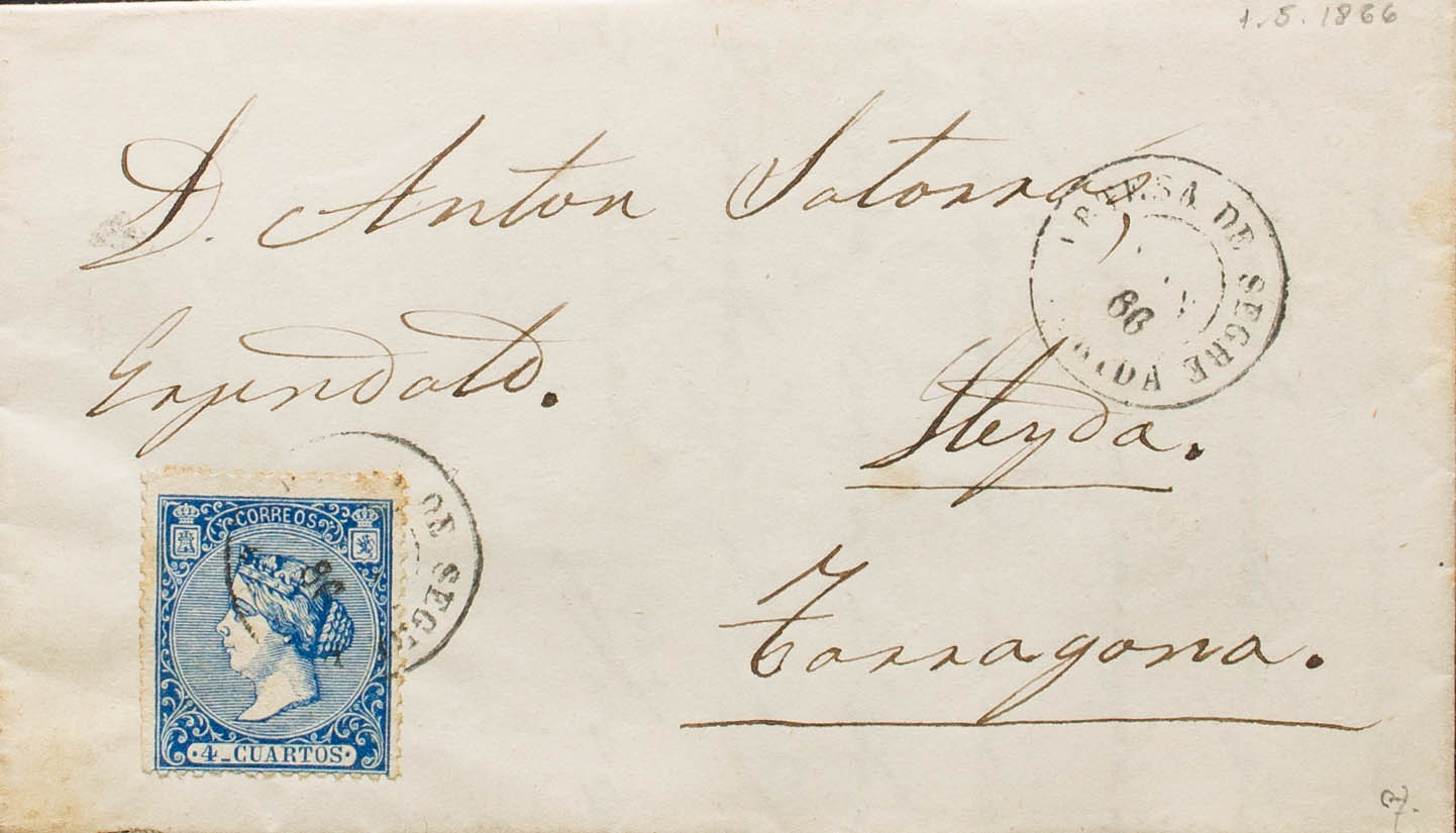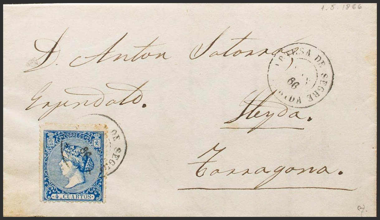 81. 1866. 4 cuartos azul. ARTESA DE SEGRE a TARRAGONA. Matasello ARTESA DE SEGRE. MAGNIFICA. Ex-Tizón.