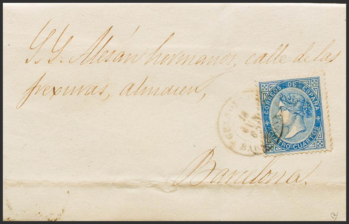 88. 1867. 4 cuartos azul. GRANOLLERS a BARCELONA. Matasello GRANOLLERS / BARCELONA. MAGNIFICA. Ex-Tizón.