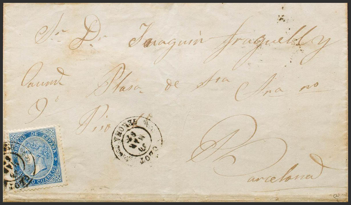 88. 1867. 4 cuartos azul. OLOT a BARCELONA. Matasello OLOT / GERONA. MAGNIFICA. Ex-Tizón.