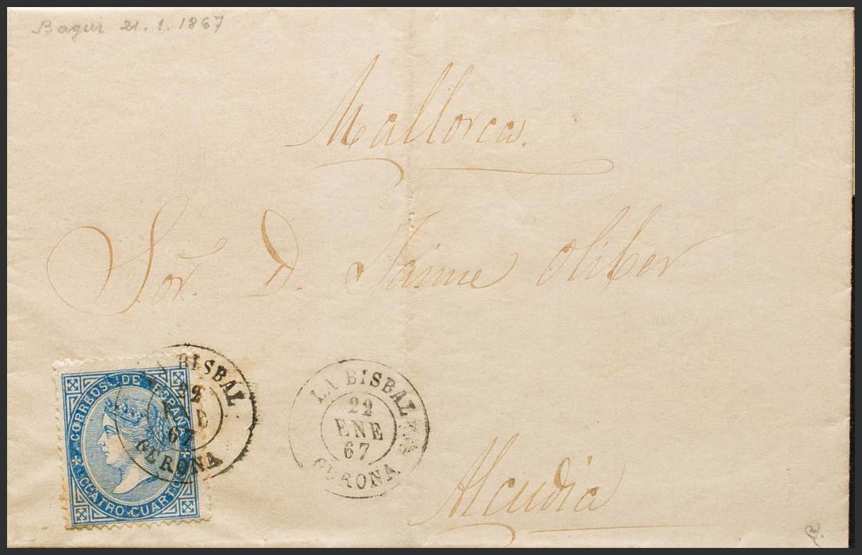 88. 1867. 4 cuartos azul. BAGUR a ALCUDIA. Matasello LA BISBAL / GERONA. MAGNIFICA. Ex-Tizón.
