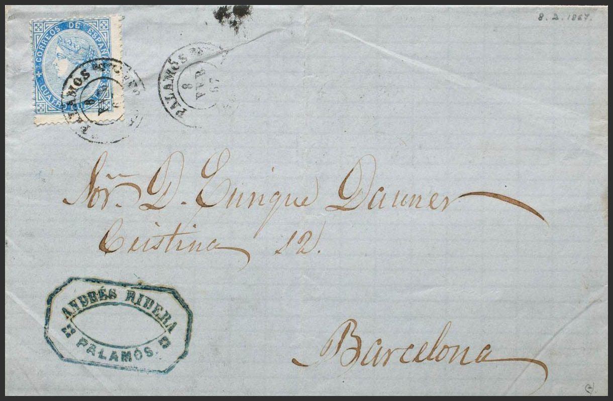88. 1867. 4 cuartos azul. PALAMOS a BARCELONA. Matasello PALAMOS / GERONA. MAGNIFICA Y RARA. Ex-Tizón.