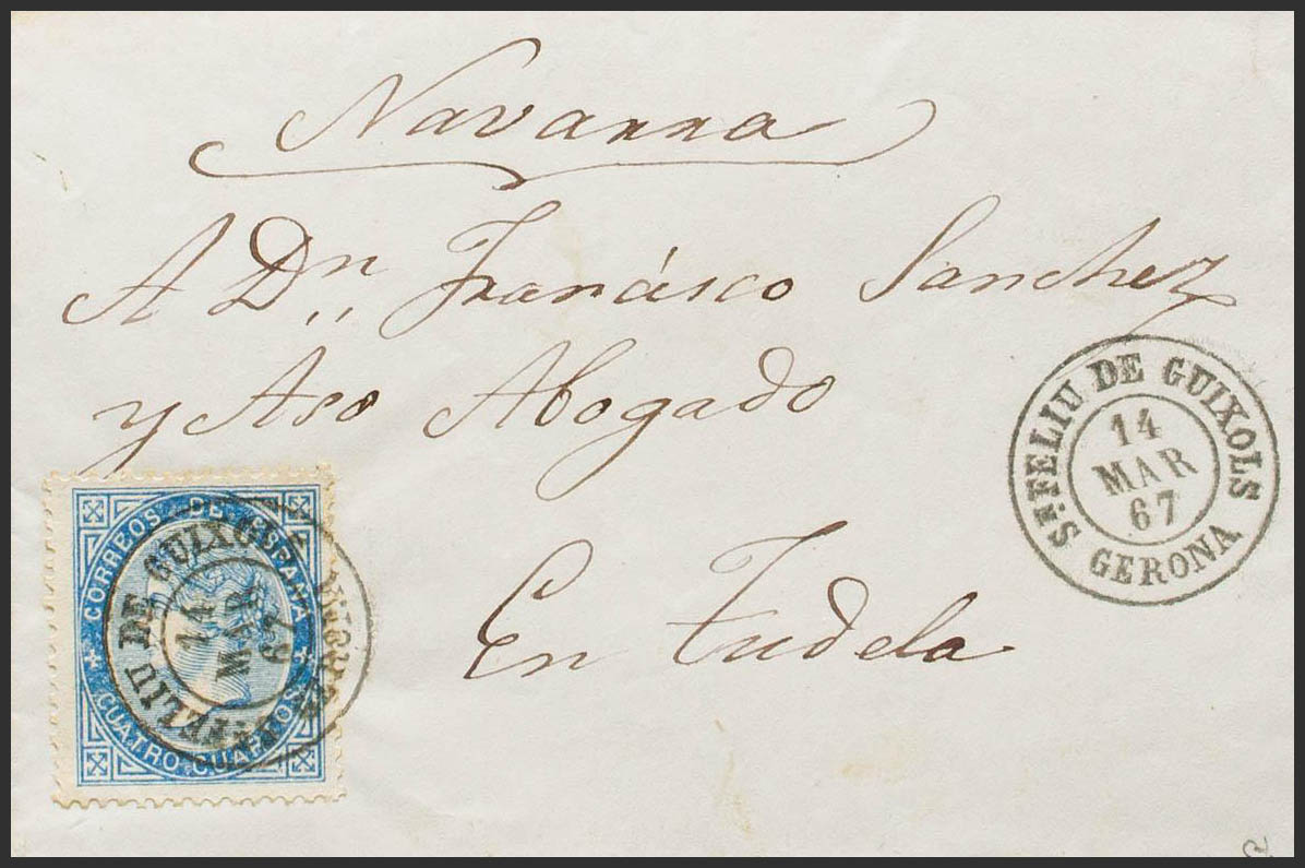 88. 1867. 4 cuartos azul. SAN FELIU DE GUIXOLS a TUDELA. Matasello SN. FELIU DE GUIXOLS / GERONA. MAGNIFICA Y RARA. Ex-Tizón.