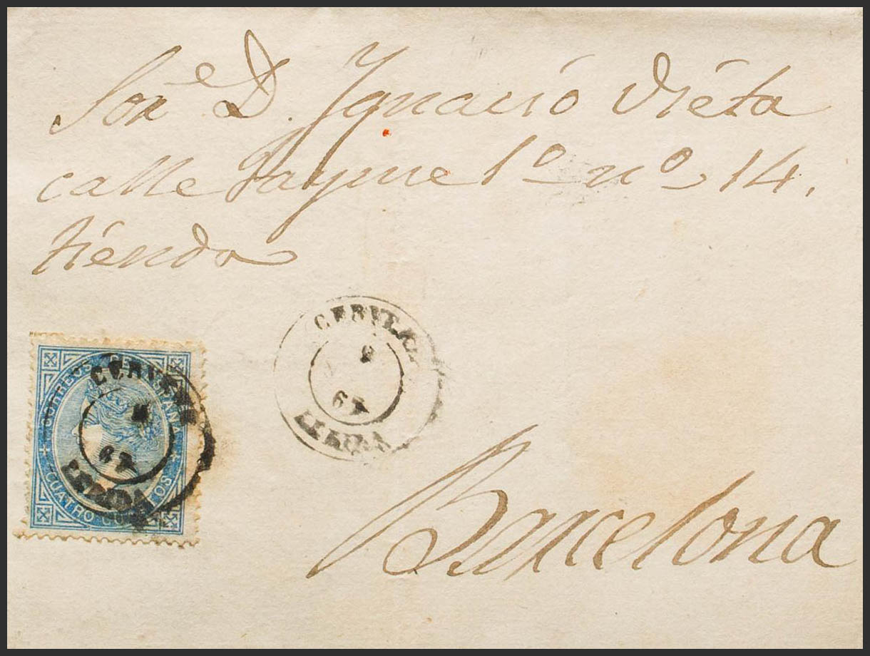 88. 1867. 4 cuartos azul. CERVERA a BARCELONA. Matasello CERVERA / LERIDA. MAGNIFICA. Ex-Tizón.
